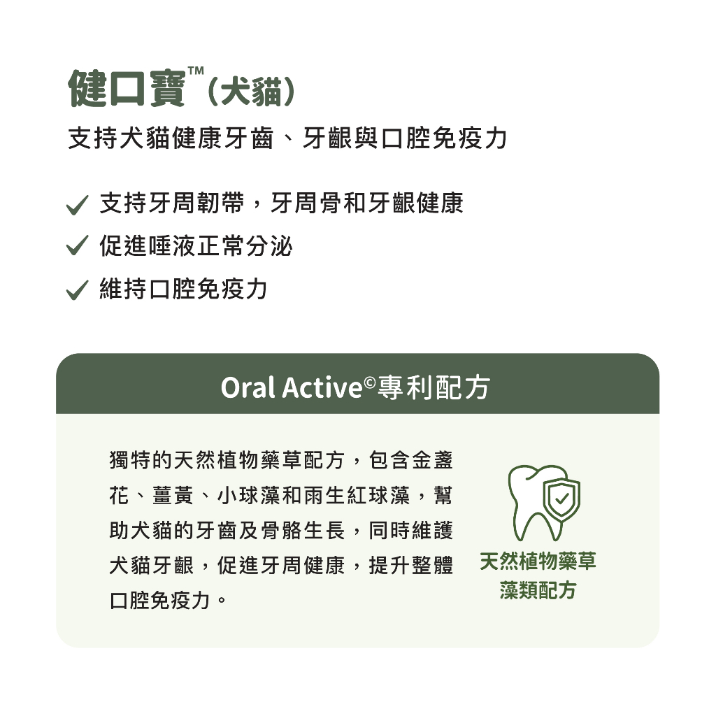 獨特的天然植物藥草配方,包含金盞花、薑黃、小球藻和雨生紅球藻,幫助犬貓的牙齒及骨骼生長,同時維護犬貓牙齦,促進牙周健康,提升整體口腔免疫力。