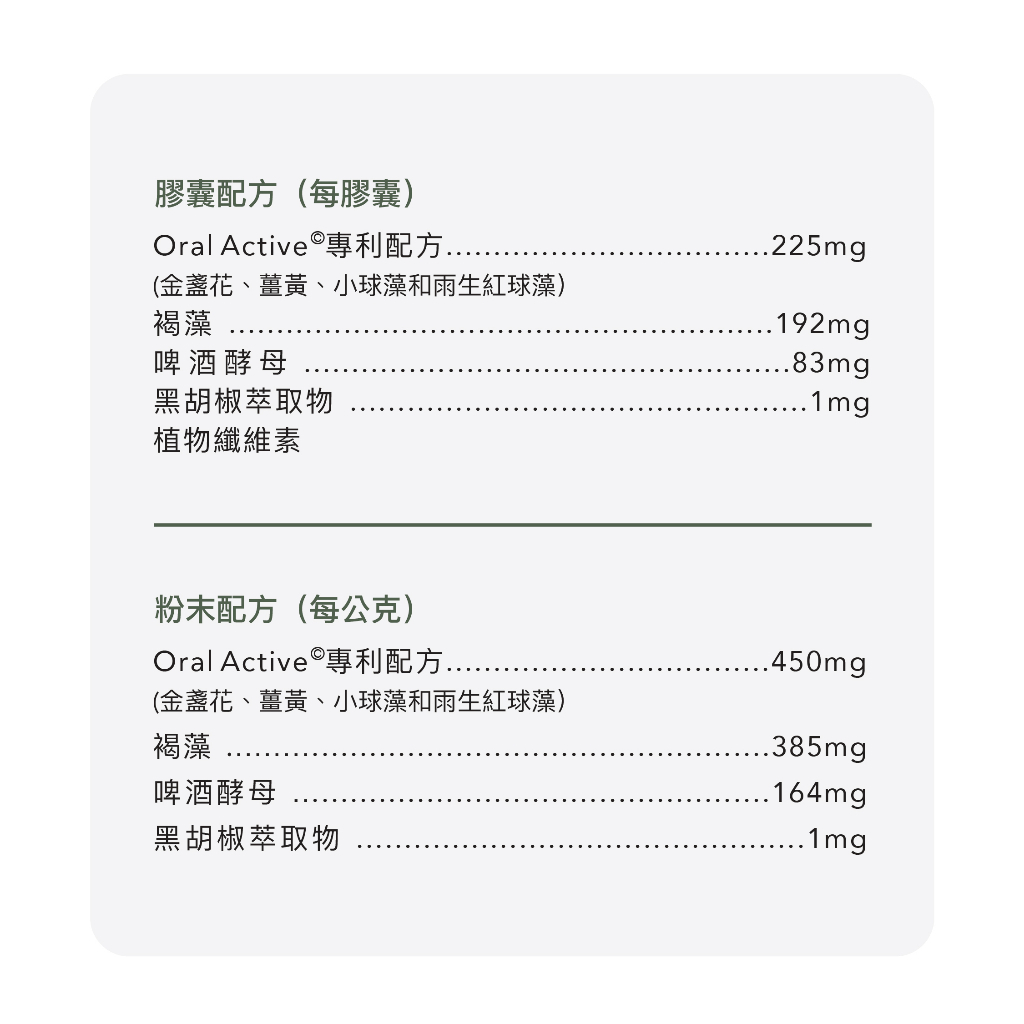Oral Active 專利配方(金盞花、薑黃、小球藻、雨生紅球藻)450毫克、褐藻385毫克、啤酒酵母164毫克、黑胡椒萃取物1毫克。