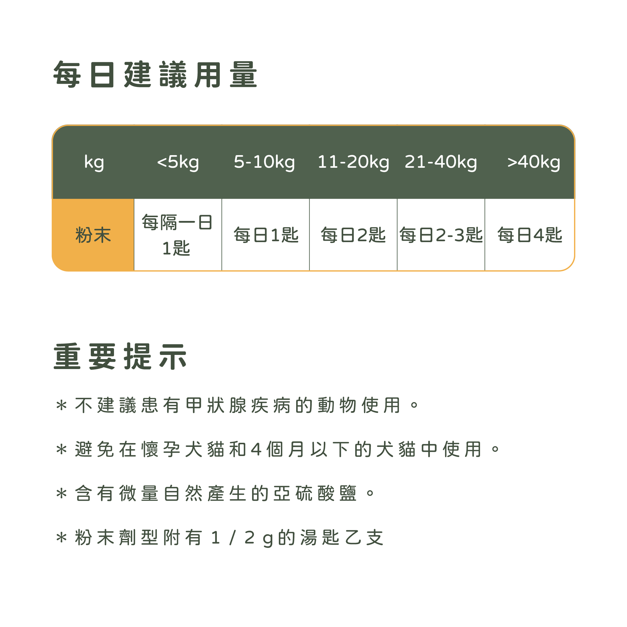 5公斤以下每隔一日½杓、6-10公斤每日1杓、11-20公斤每日2杓、21-40公斤每日2-3杓、40公斤以上每日4杓。