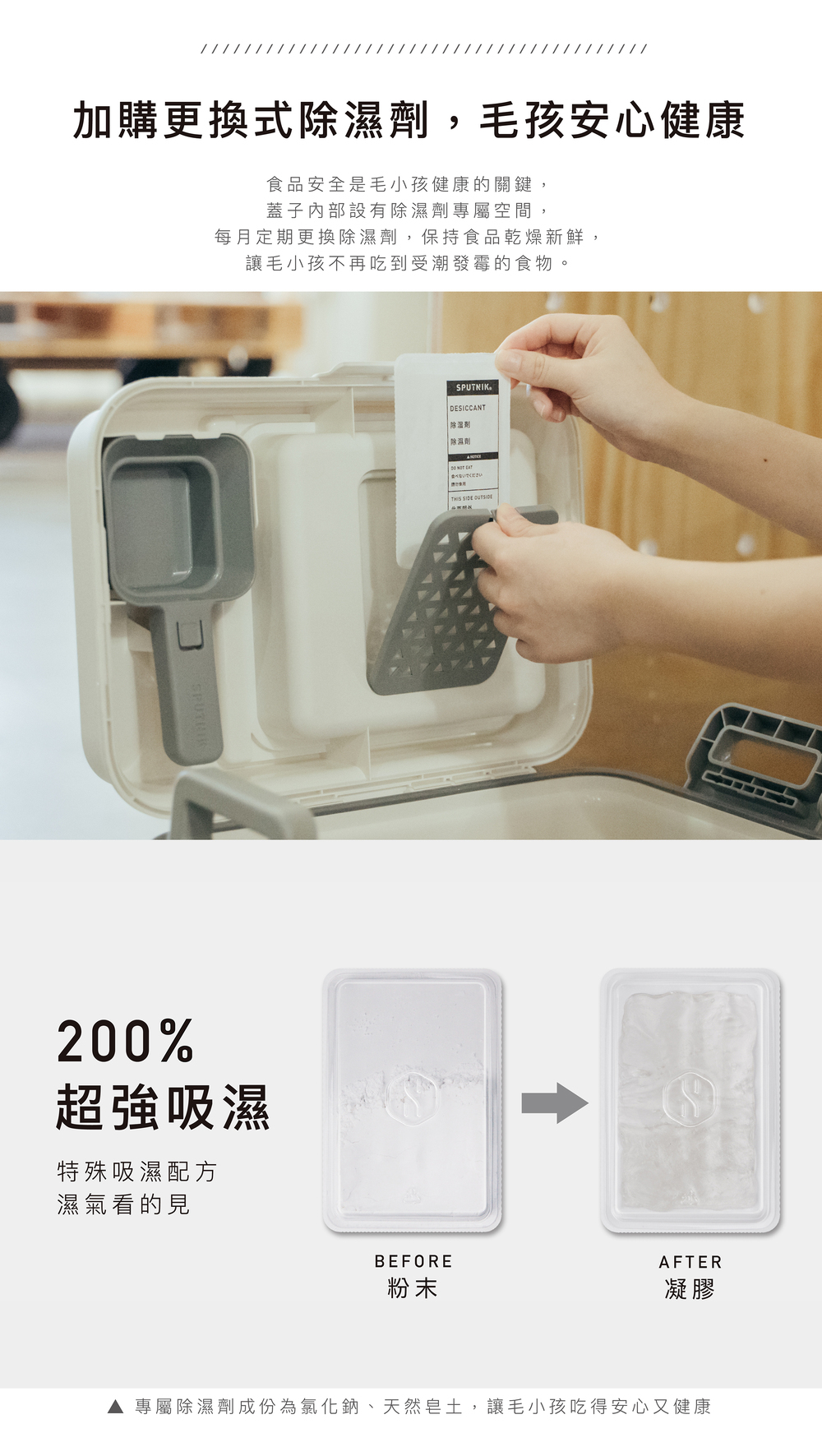 除溼劑內容物:氯化鈣、天然皂土