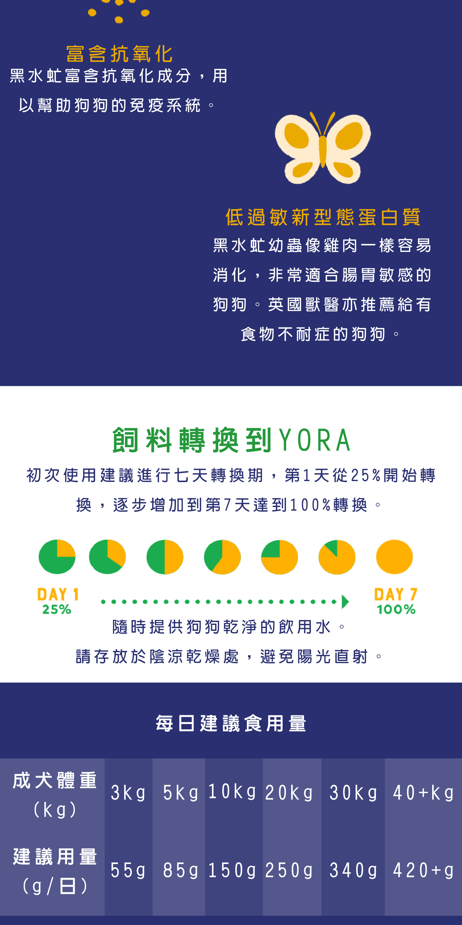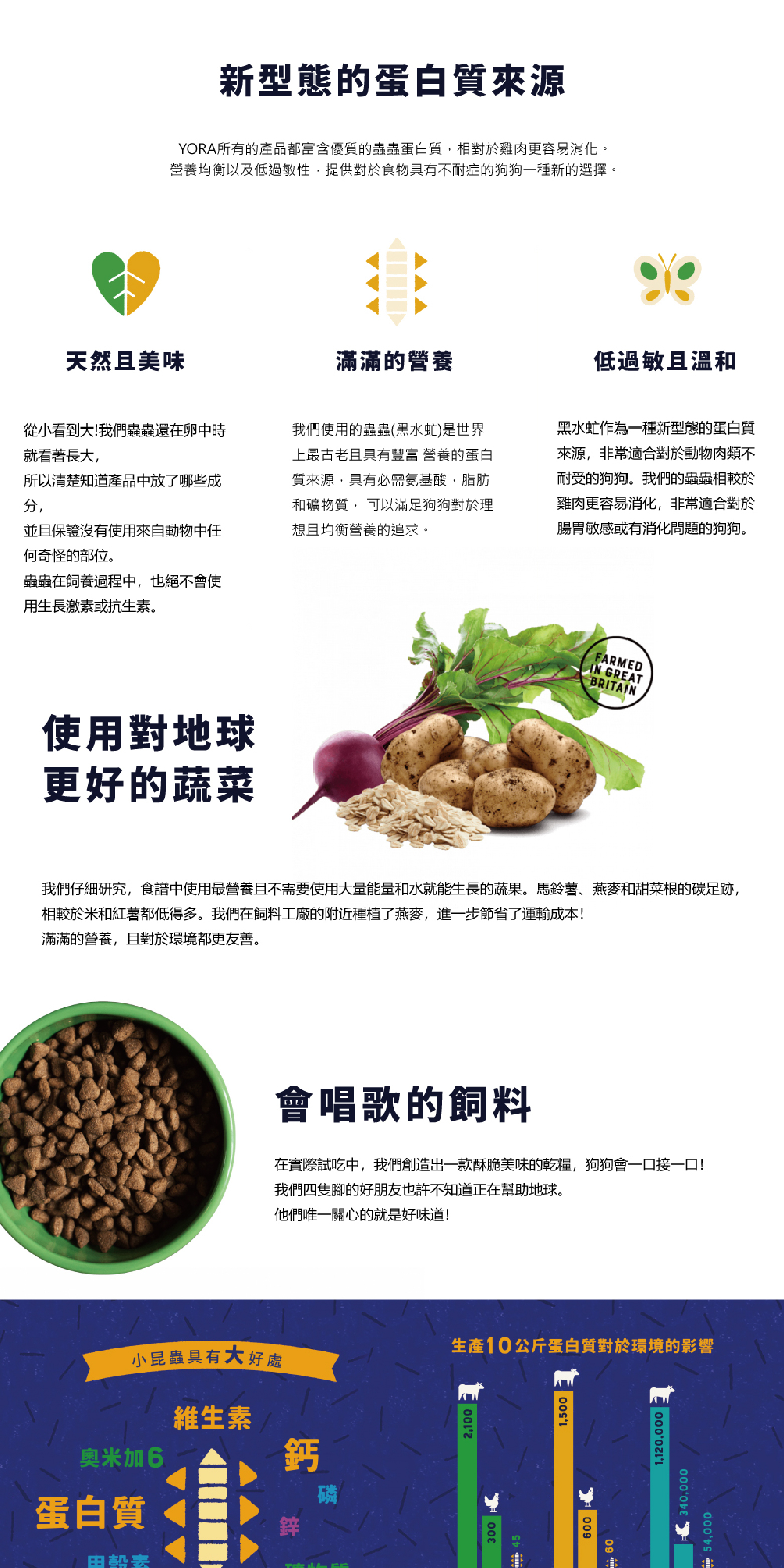 40%昆蟲(黑水虻)(昆蟲粉26.2%,新鮮昆蟲8.3%,昆蟲油5.5%)、燕麥 (19%)、馬鈴薯(19%)、玉米、豌豆、啤酒酵母、海藻(2%)、亞麻籽、 番茄粕、礦物質、維生素、脫水甜菜根(0.5%)、菊苣漿、脫水南瓜、 脫水胡蘿蔔、葡萄糖胺(575毫克/公斤)、軟骨素(575毫克/公斤)、脫 水羽衣甘藍、脫水歐芹。 |