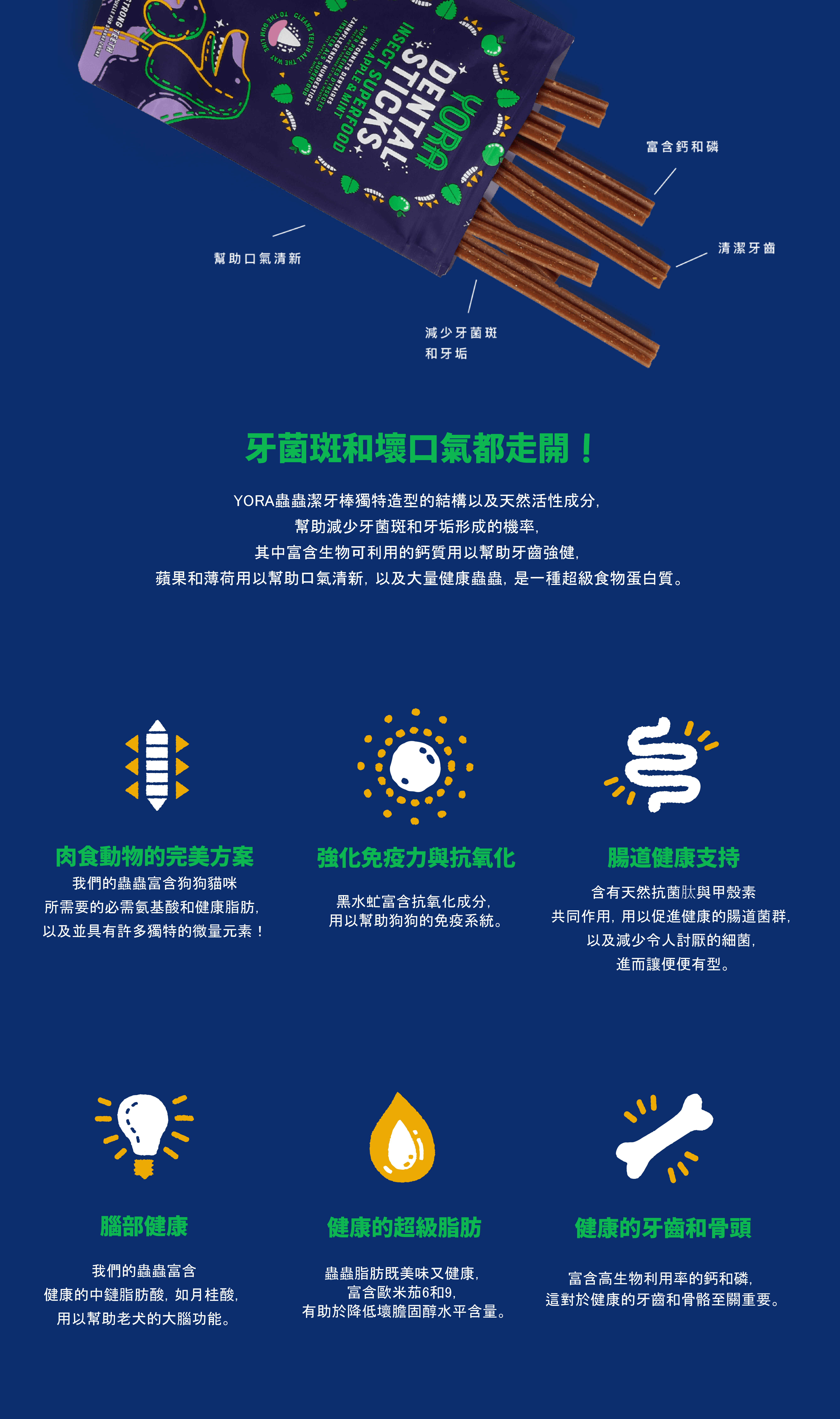脫水昆蟲蛋白(27%)、豌豆澱粉、植物甘油、豌豆、馬鈴薯澱粉、植物纖維(4%)、蘋果乾(4%)、礦物質(包括六偏磷酸鈉(0.6%))、薄荷(2%)、酵母、醋粉。 |