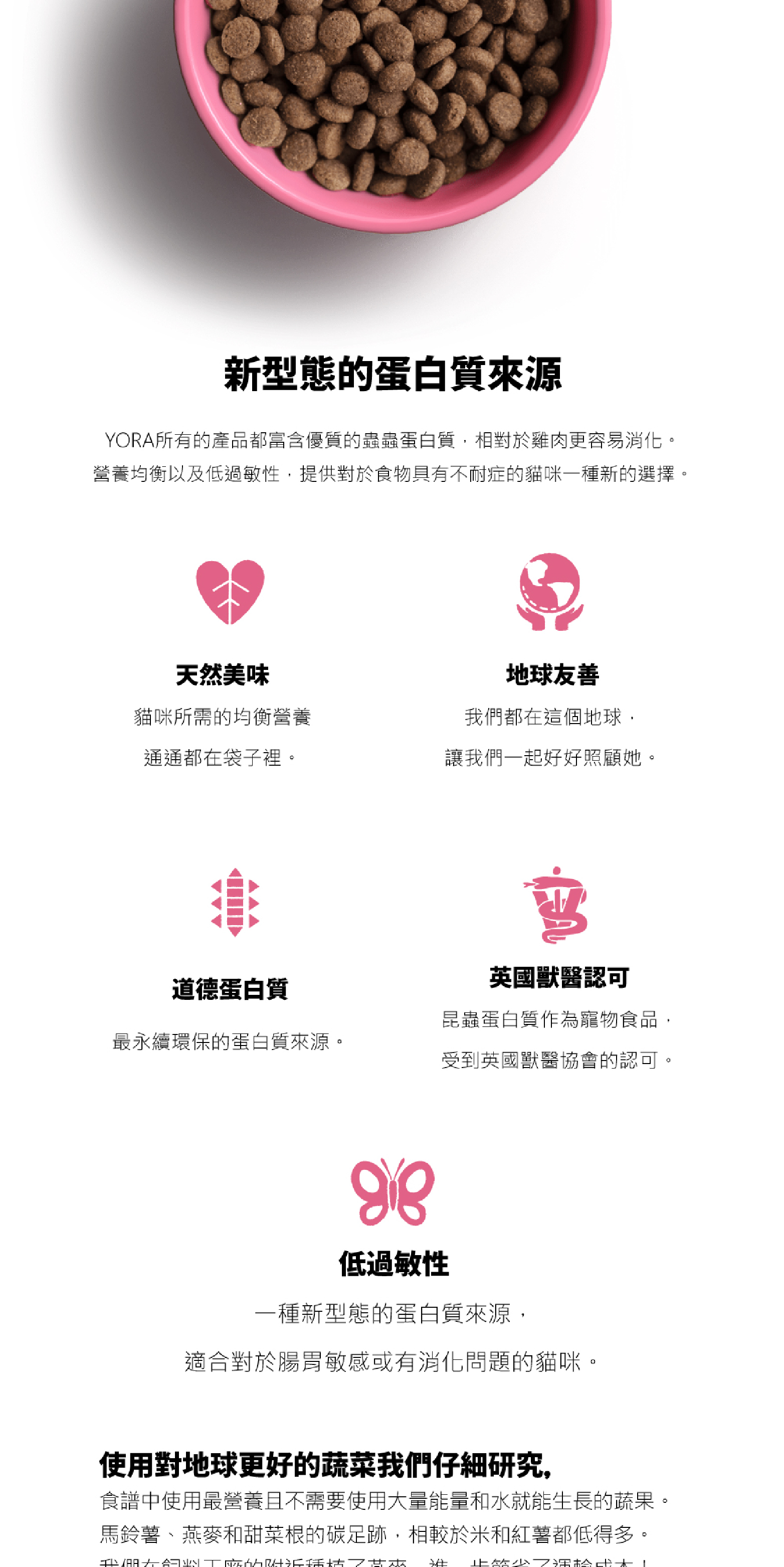 提供12個月以上成貓完整且均衡的蟲蟲蛋白質飼料。