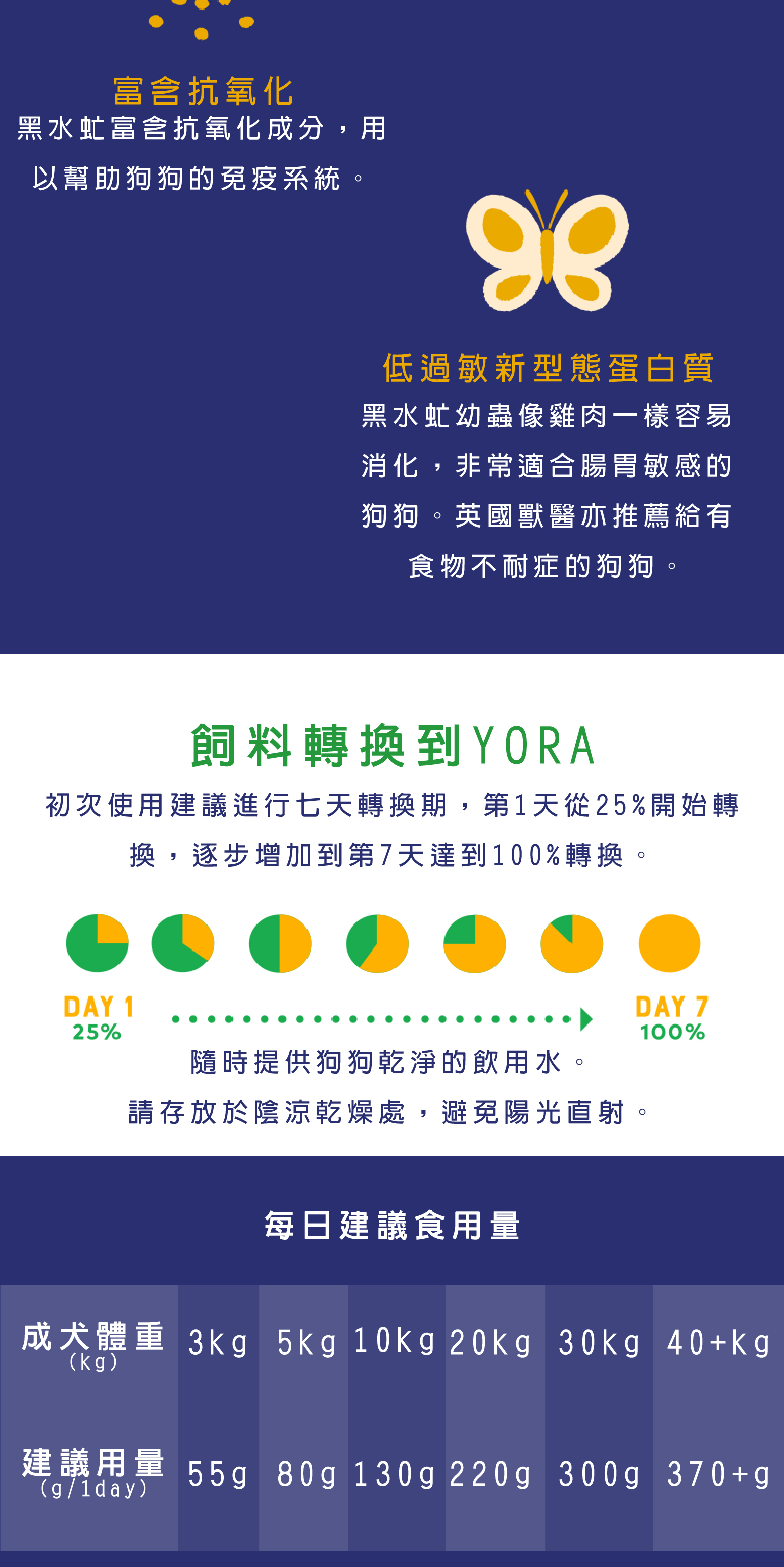 36%昆蟲(黑水虻)(昆蟲粉24%、新鮮昆蟲8.5%、昆蟲油3.5%)、玉米、 |