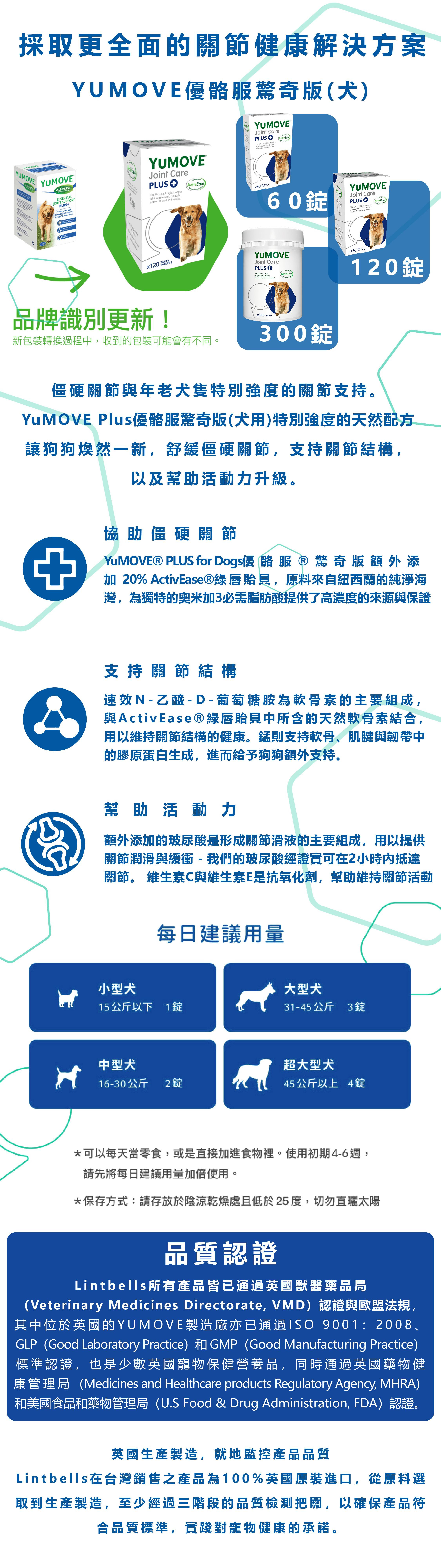 YuMOVE Plus優骼服驚奇版(犬用)特別強度的天然配方,讓狗狗煥然一新,舒緩僵硬關節,支持關節結構,以及幫助活動力升級。
