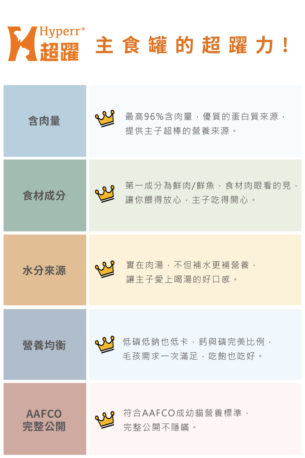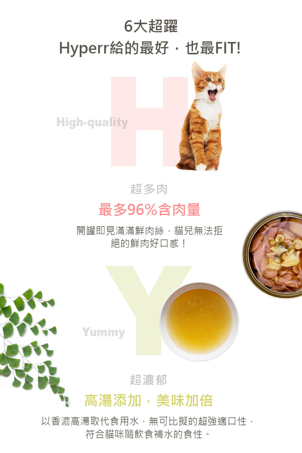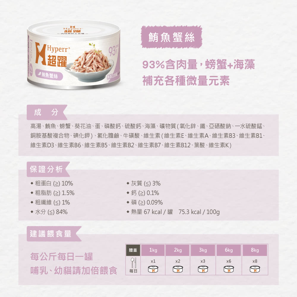最多96%含肉量,開罐滿滿的肉絲搭配香濃高湯,適口性絕佳;超完美比例,低磷、低卡配方,輕鬆吃無負擔,無添加凝結膠、澱粉穀物,安心吃超健康!