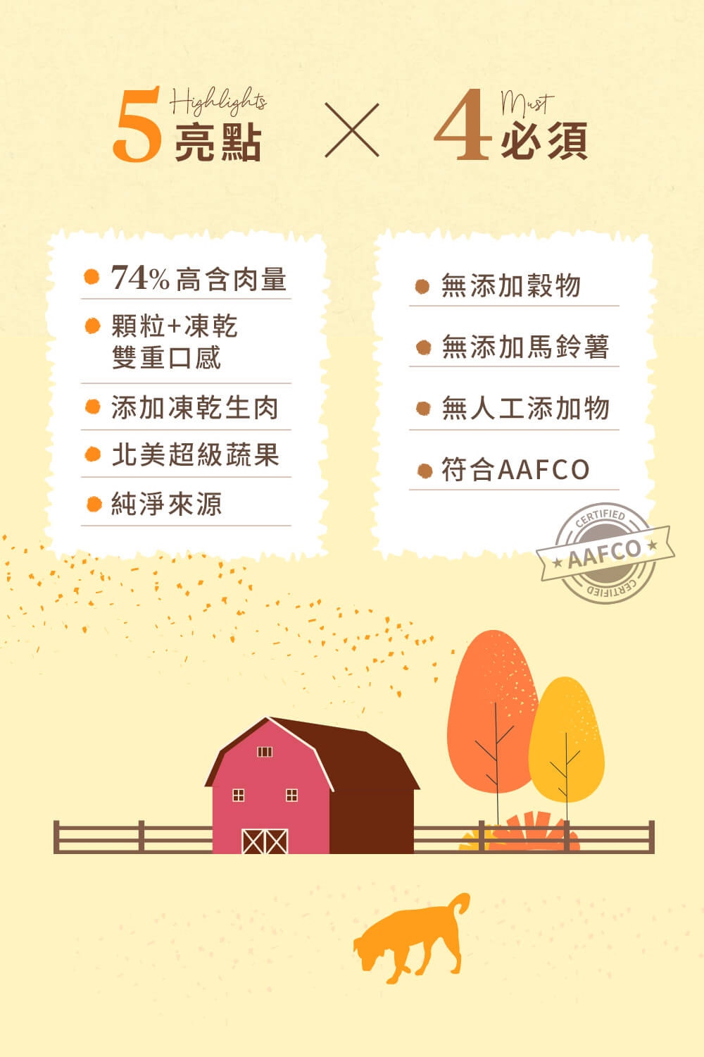 ・74%高含肉量,新鮮肉塊X當季蔬果,無穀無人工添加