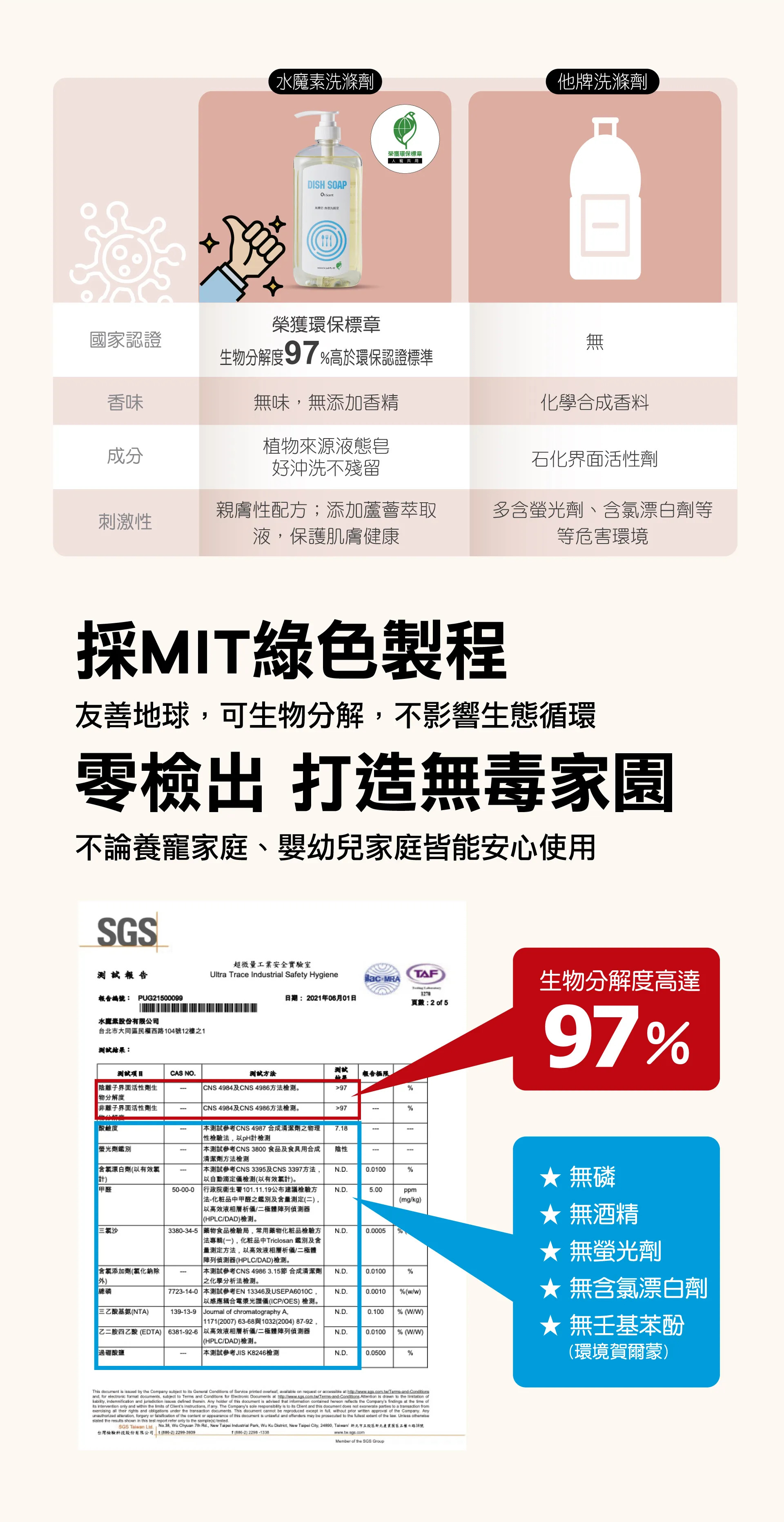 經過長達一年檢驗與審查,水魔素馬賽皂食器洗滌酵素從原料、包裝到工廠生產等皆通過行政院環境保護署『環保標章』產品認證,經國際檢測單位SGS檢測生物分解度為97%,達到環保友善環境之認證標準。證書請見照片