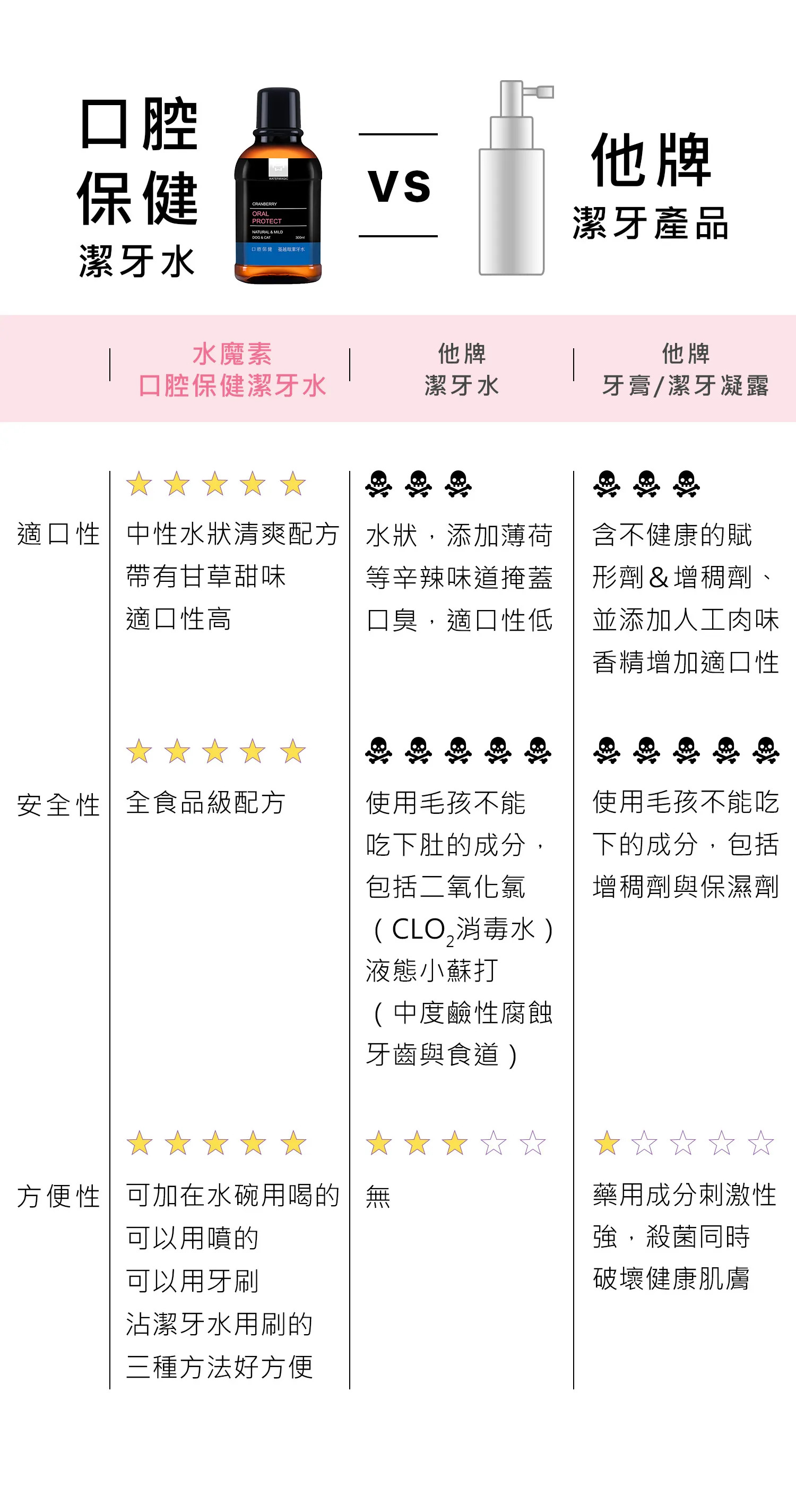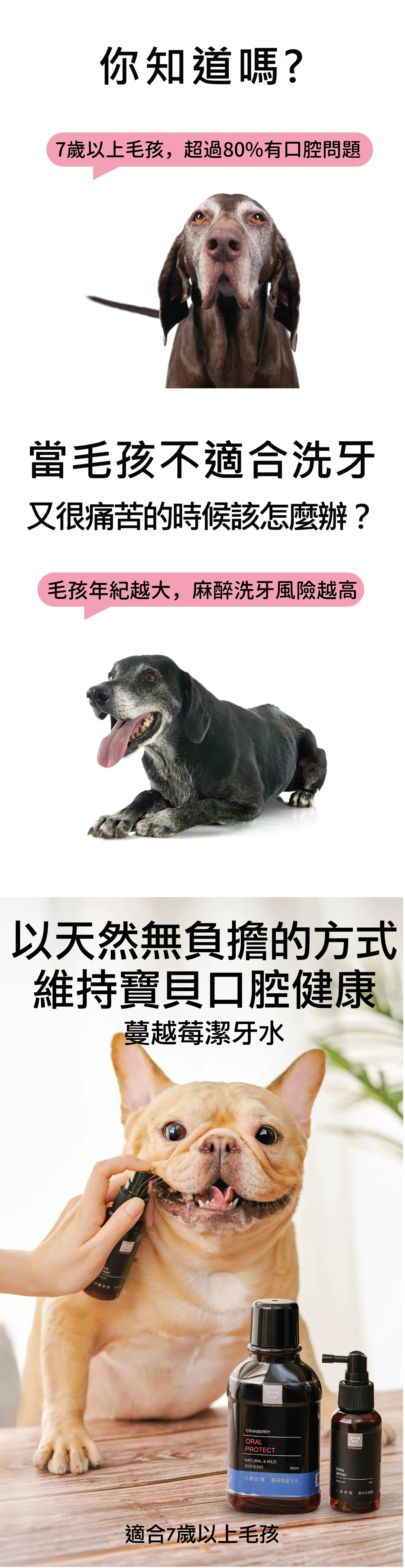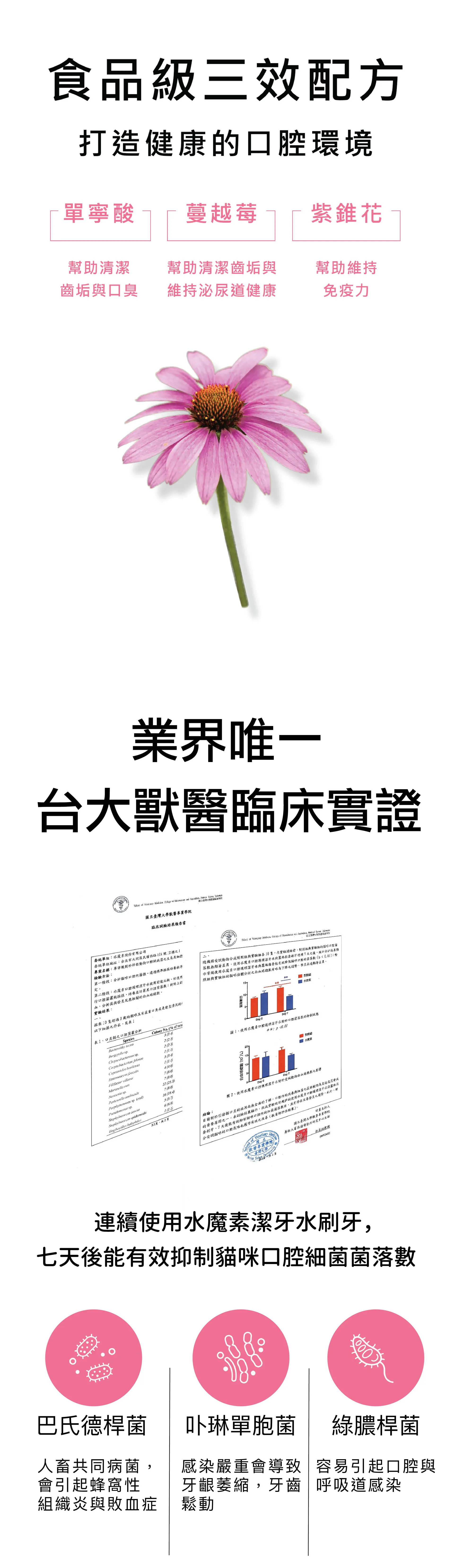 水魔素針對貓咪狗狗潔牙再升級,「單寧酸+紫錐花+蔓越莓」三效防護配方,