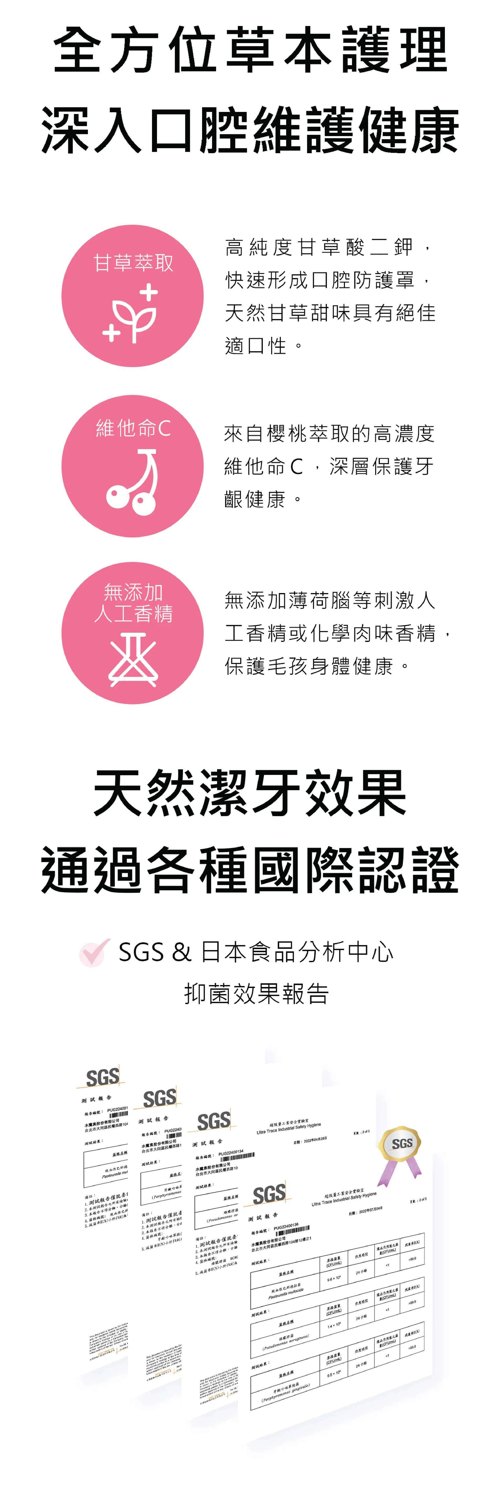 長效幫助貓狗口腔清潔。並通過SGS國際認證與日本研究證實有效降低狗口臭及牙菌斑孳生