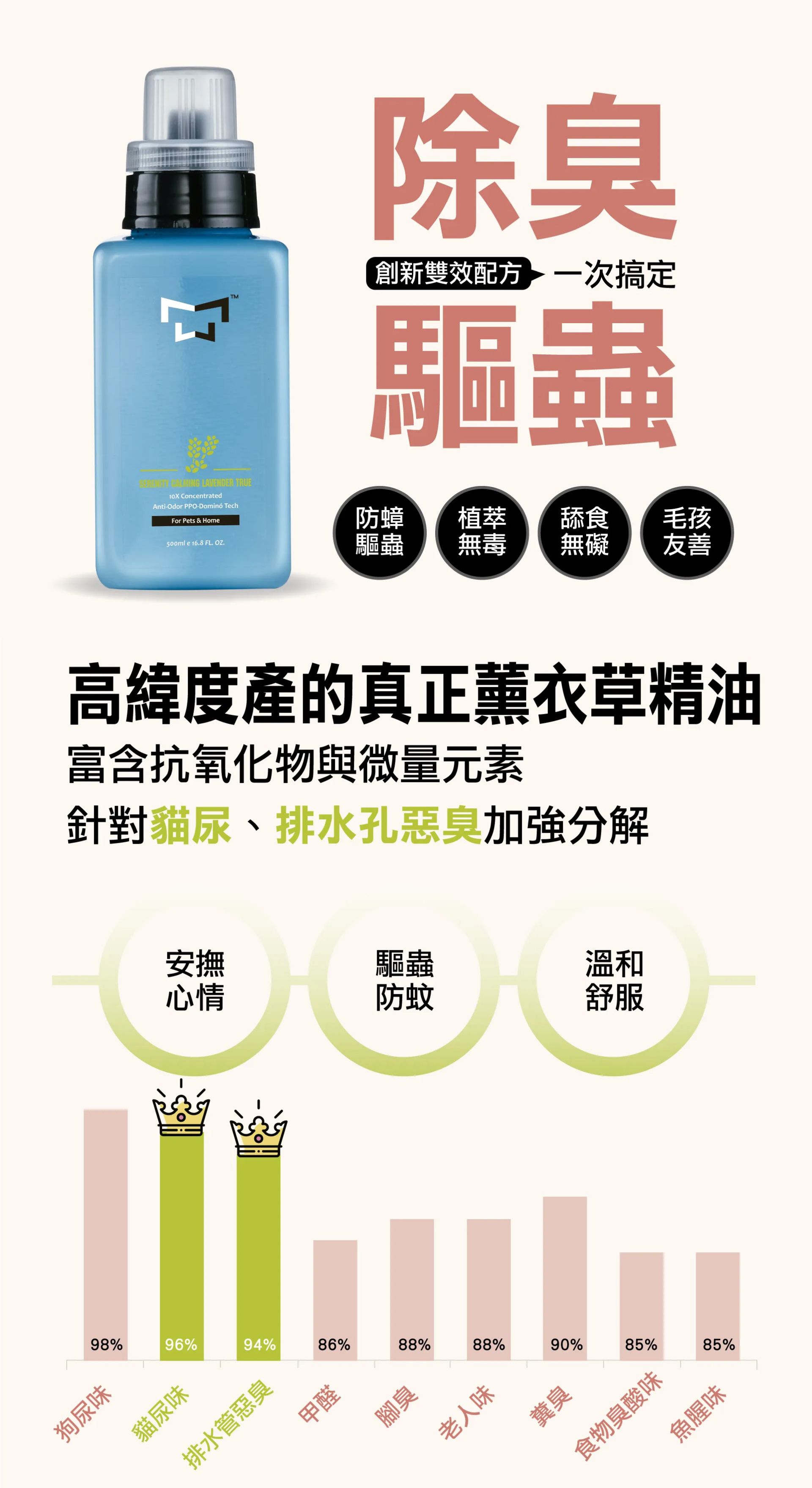 『薰衣草除臭濃縮液』是針對貓咪家庭所設計的寵物除臭&除蟑螂的創新雙效產品