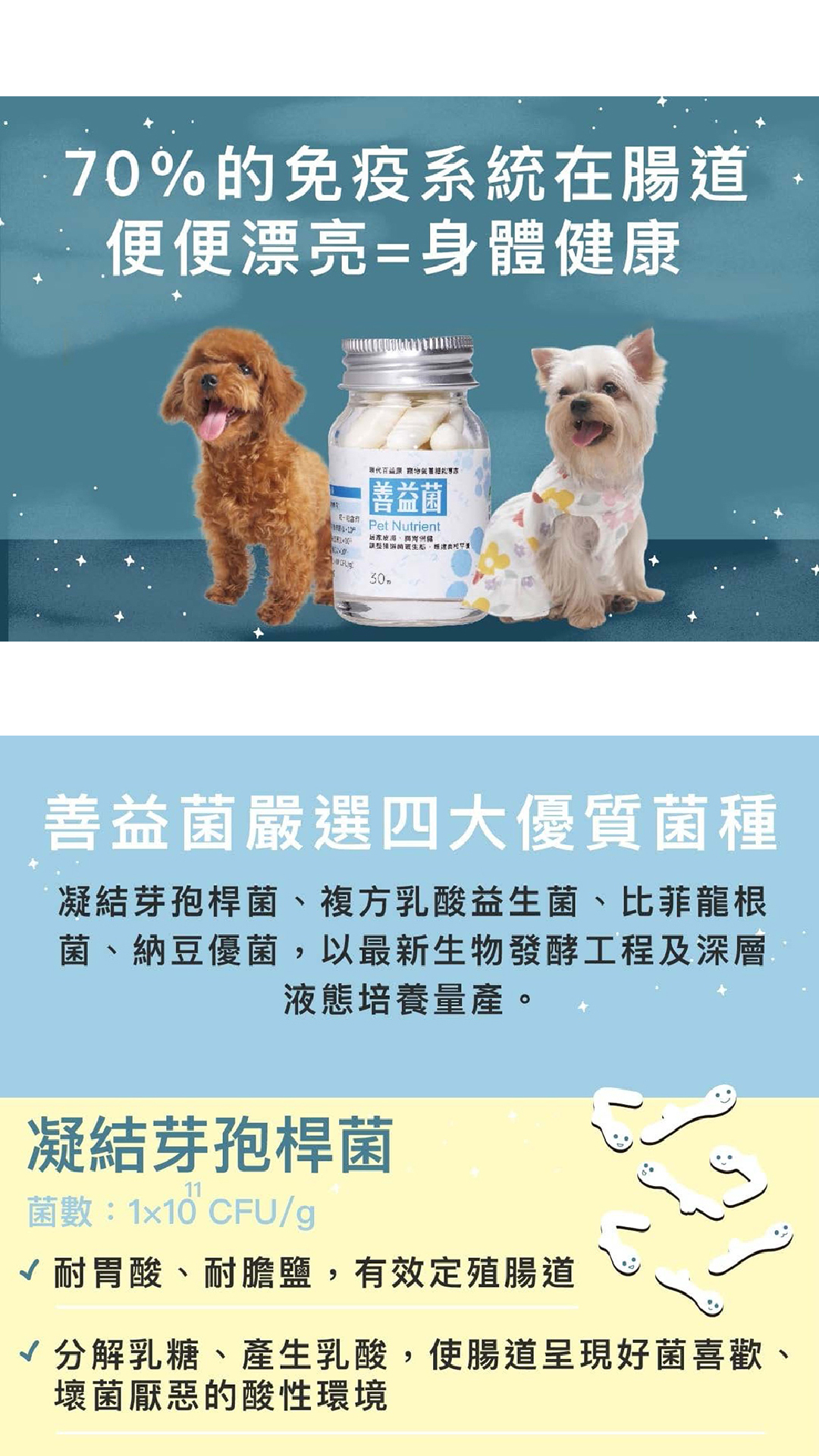 ◆善益菌嚴選四大優質菌種:凝結芽孢桿菌、複方乳酸益生菌、比菲龍根菌、納豆優菌,以最新生物發酵工程及深層液態培養量產,能調整寵物腸道內的菌叢生態。其中複方益生菌,能讓寵物維持抵抗力。