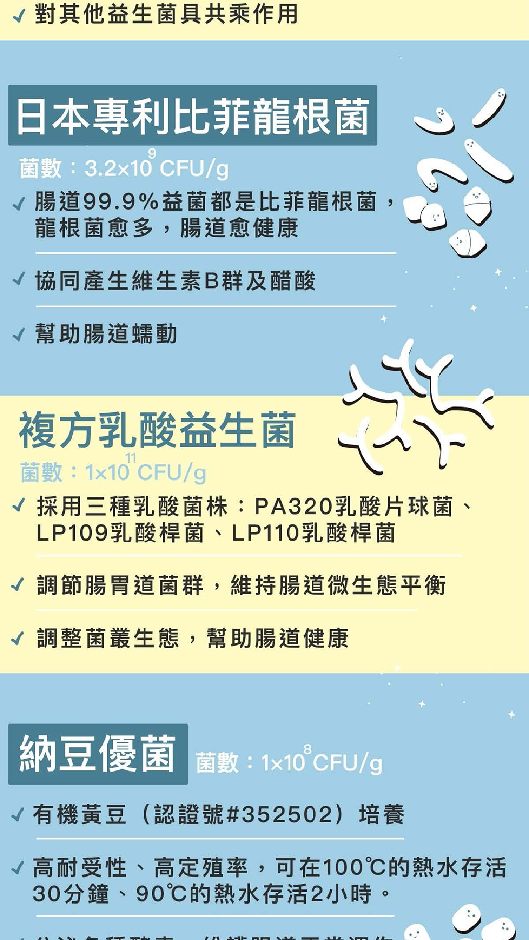 • 建議不要和其他品牌益生菌混合使用,有些菌種類別不同不一定相容,可能互相抵制造成腸內菌叢及菌相的改變。