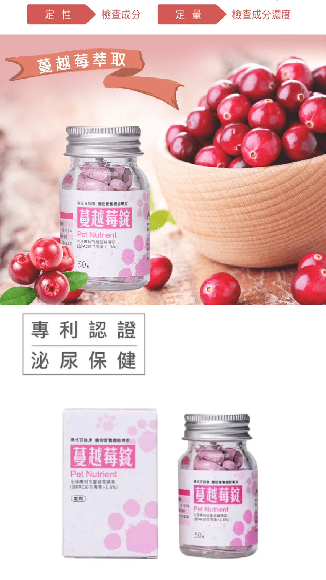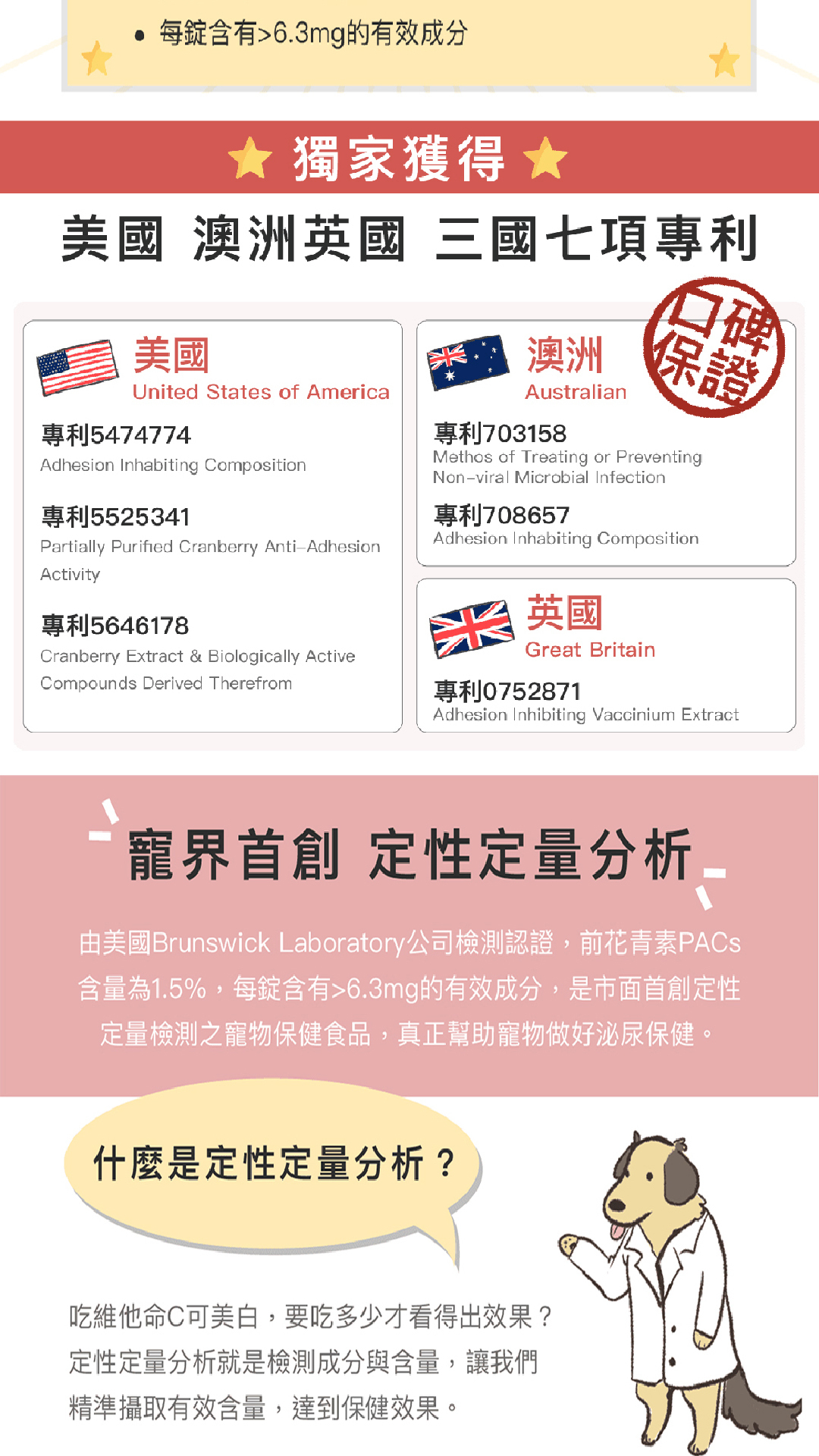寵界首創定性定量蔓越莓保健品,前花青素PACs含量為1.5%,每錠含有>6.3mg的有效成分,真正做好尿道、泌尿系統保健。