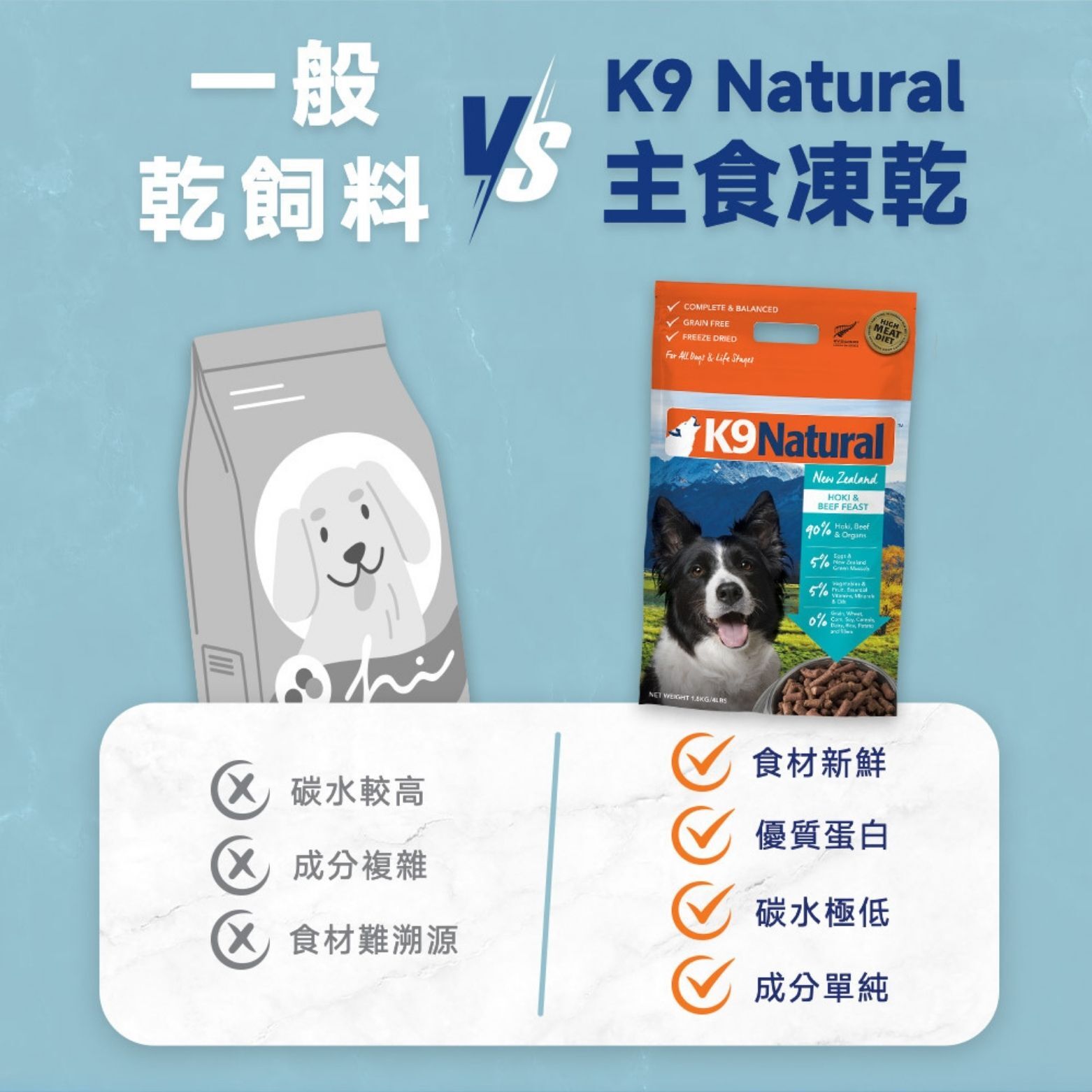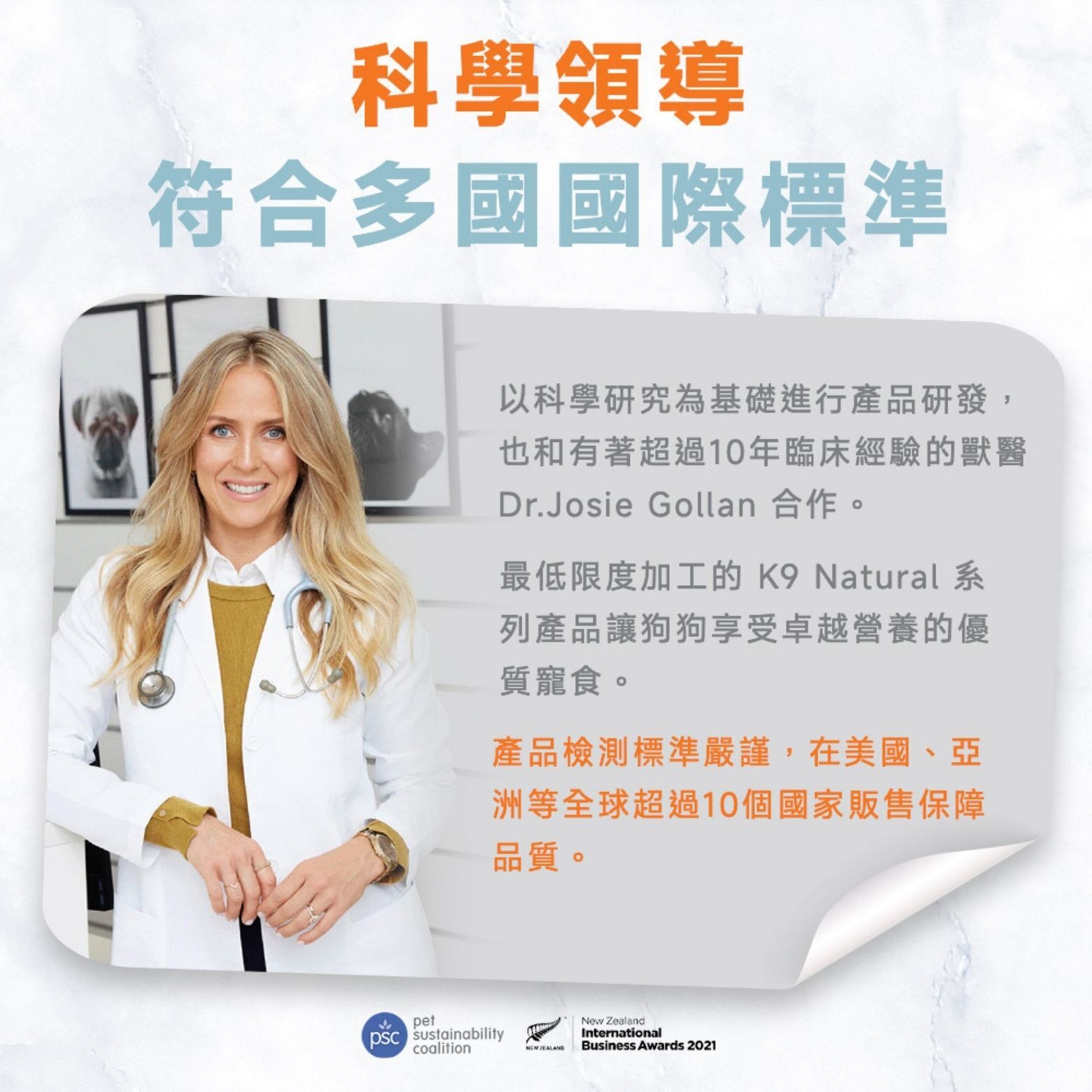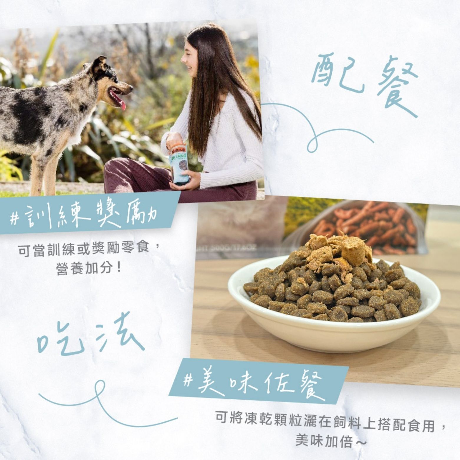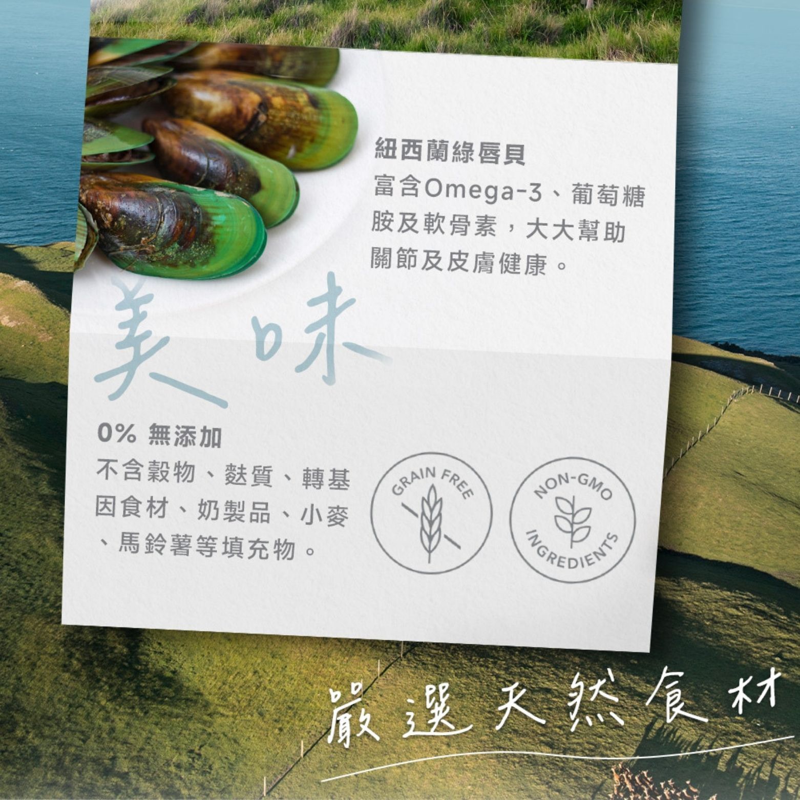成分: 鱈魚、牛肉、牛肚、牛肝、牛腎、牛心、牛血、牛脾、雞蛋、葵花籽油、亞麻籽殼、棕色海藻、紐西蘭綠唇貝、南瓜、綠花椰菜、花椰菜、甘藍菜、磷酸氫二鉀、乾海藻、蘋果、梨、鹽、維生素E、鋅蛋白、鐵蛋白、氧化鎂、硒酵母、銅蛋白、錳蛋白、β-胡蘿蔔素、維生素B1、維生素D3