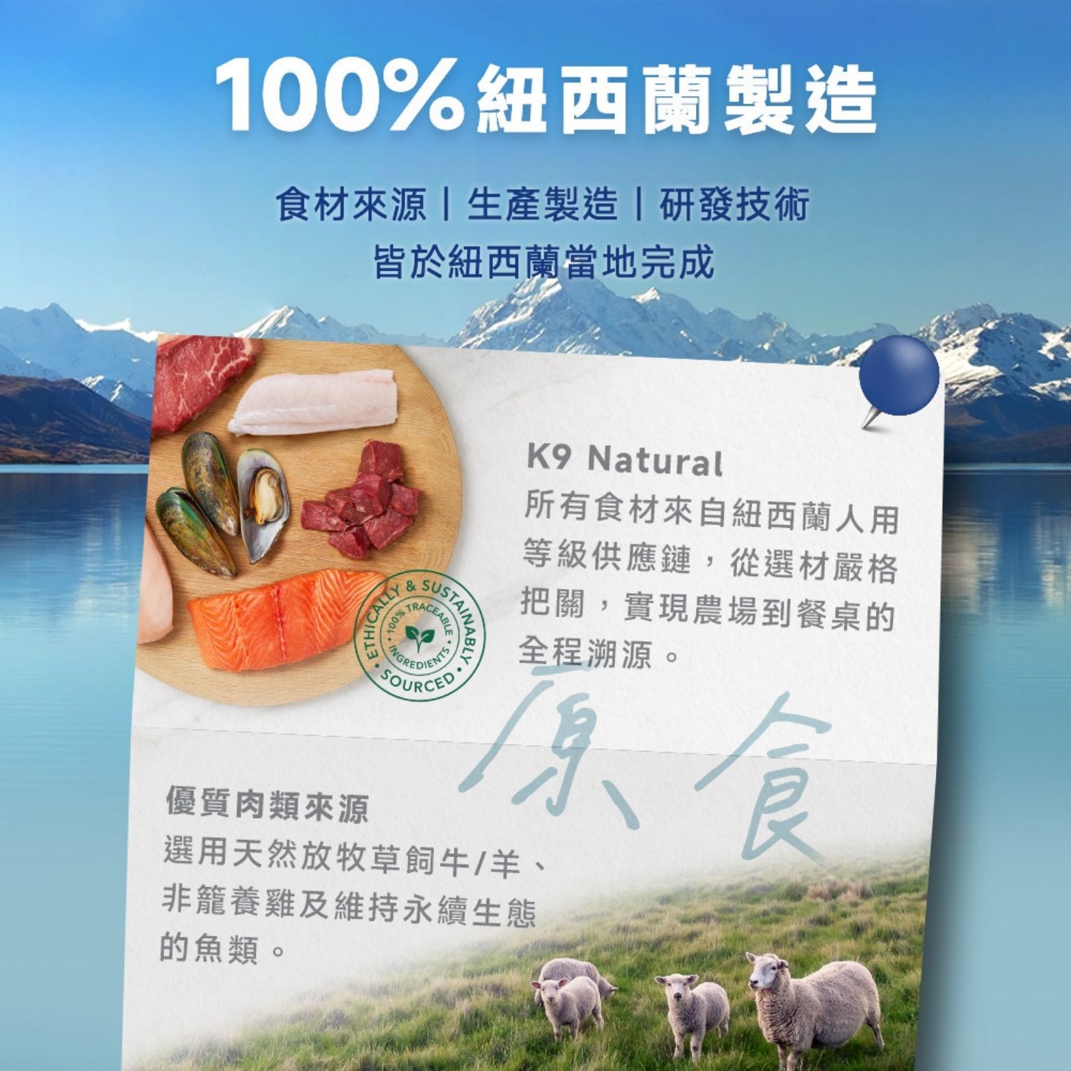 成分: 羊肉、羊肚、羊心、帝王鮭、羊腎、羊肝、羊血、雞蛋、羊脾、磨碎羊骨、葵花籽油、亞麻籽殼、褐藻、紐西蘭綠唇貝、南瓜、綠花椰菜、花椰菜、甘藍菜、磷酸氫二鉀、乾海藻、蘋果、梨、鹽、維生素E、鋅蛋白、鐵蛋白、氧化鎂、硒酵母、銅蛋白、錳蛋白、β-胡蘿蔔素、維生素B1、維生素D3