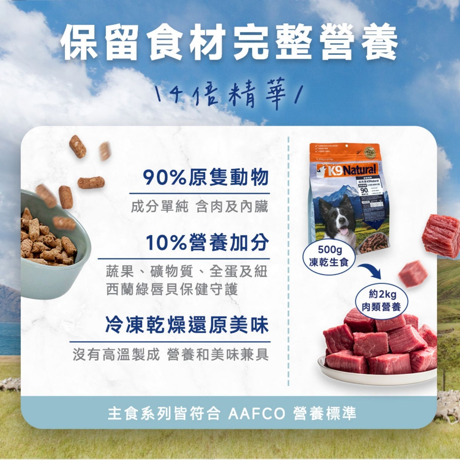 成分: 羊肉、羊肚、羊心、羊肺、羊肝、羊腎、葵花籽油、亞麻籽、碎羊骨、胡蘿蔔、綠唇貽貝、南瓜、青花菜、乾燥海帶、磷酸氫二鉀、維生素 E 、鹽、礦物質(蛋白鋅、蛋白鐵、氧化鎂、硒酵母、蛋白銅、蛋白錳)、 維生素群(維生素B1、維生素A、維生素B9、維生素 D3)。