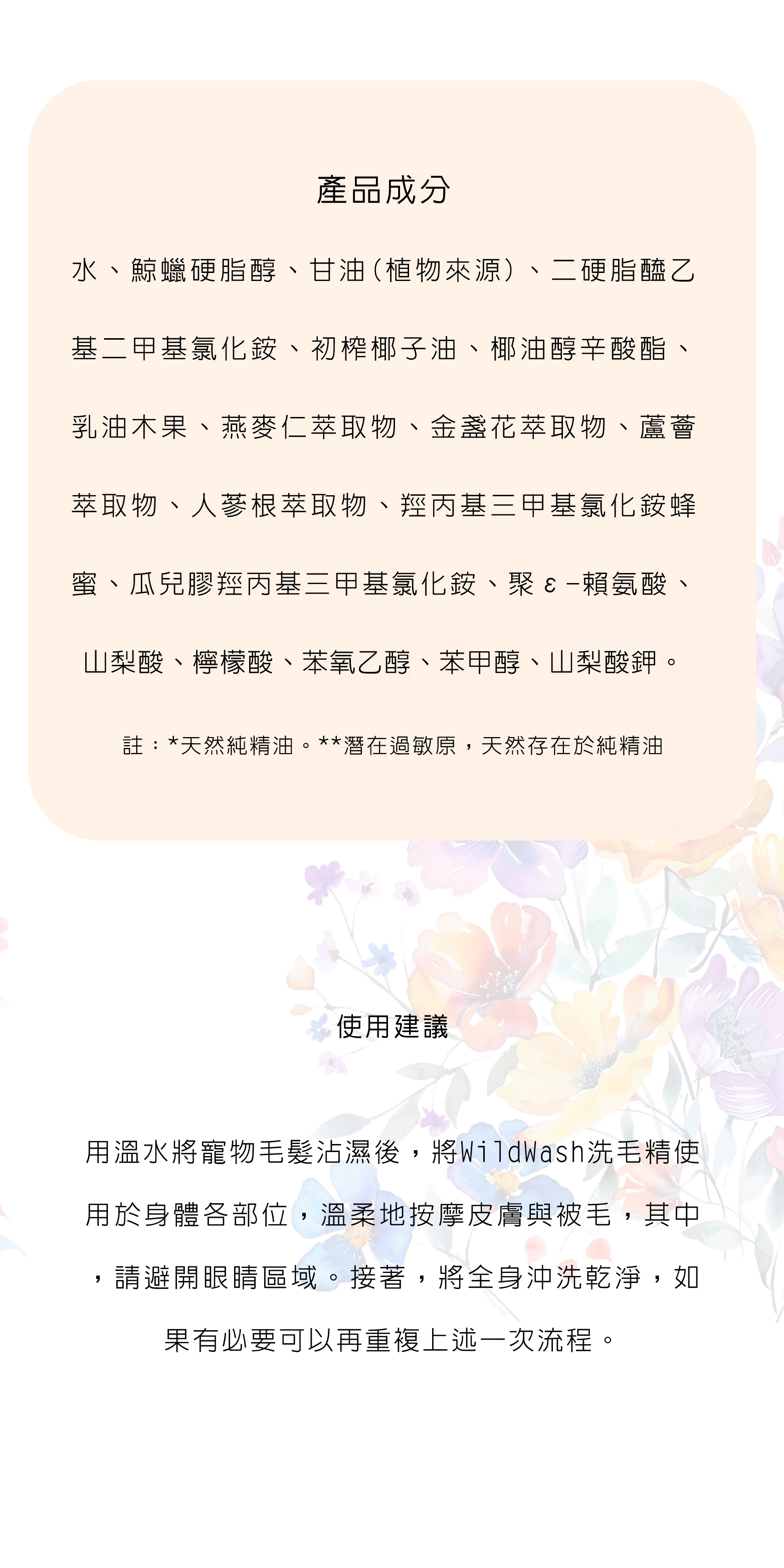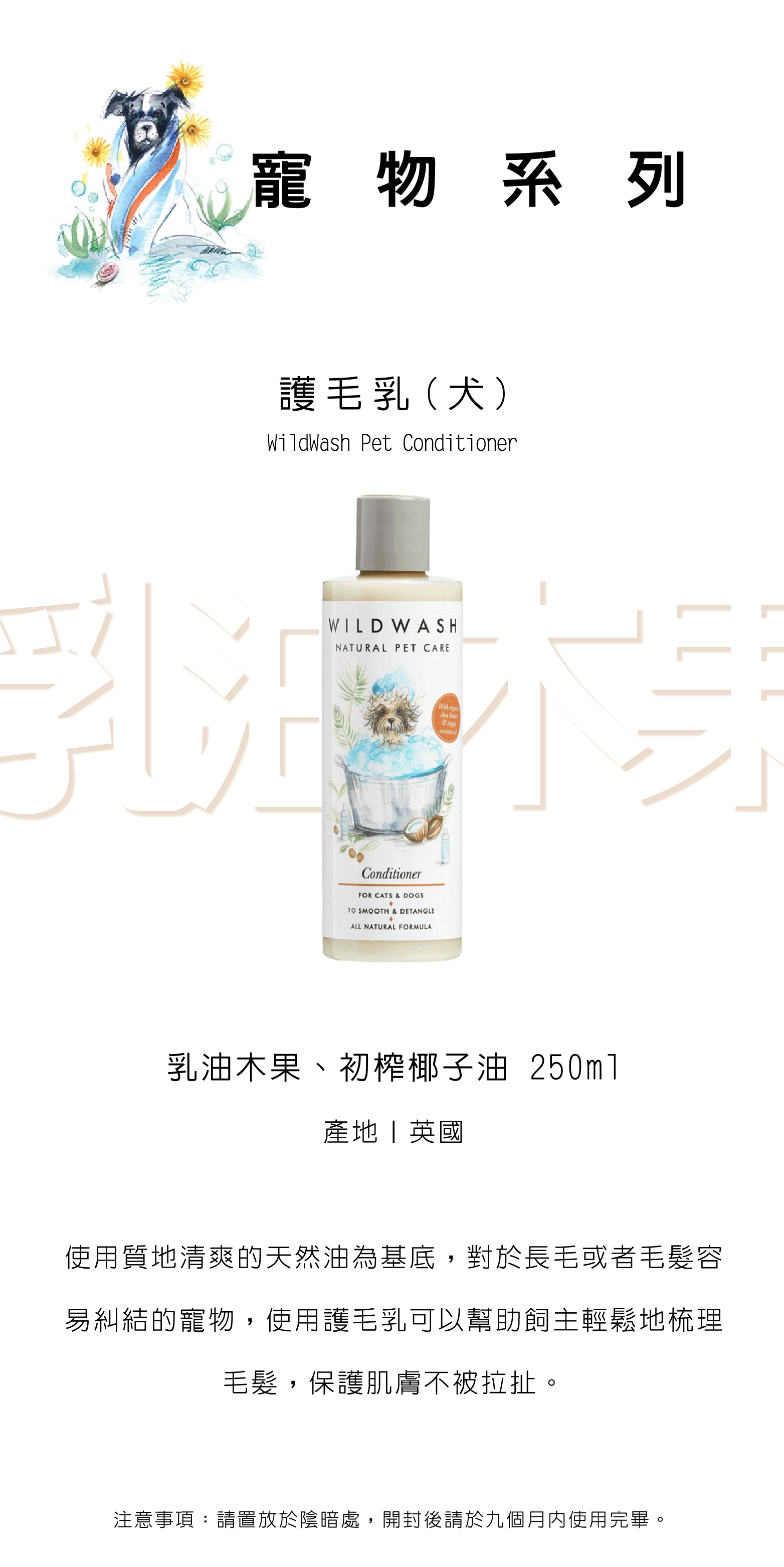 使用WildWash洗毛精後,徹底沖洗。取適量WildWash護毛乳塗抹在溼的被毛上,並輕柔地按摩。停留一至兩分鐘後,再使用溫水將全身洗淨。