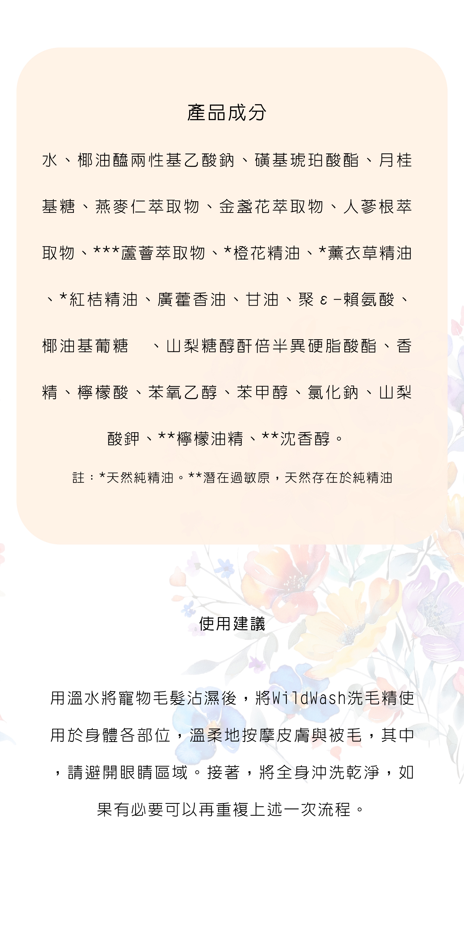 用溫水將寵物毛髮沾濕後,將WildWash洗毛精使用於身體各部位,溫柔地按摩皮膚與被毛,其中,請避開眼睛區域。接著,將全身沖洗乾淨,如果有必要可以再重複上述一次流程。
