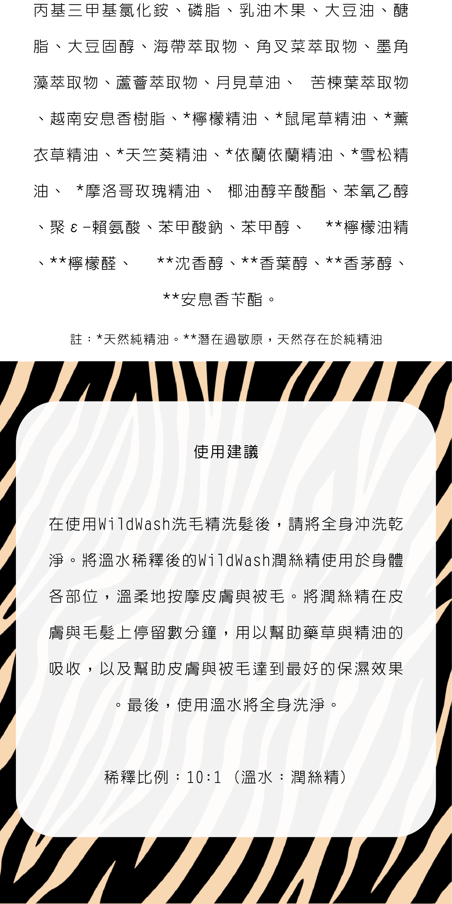 在使用WildWash洗毛精洗髮後,請將全身沖洗乾淨。將溫水稀釋後的WildWash潤絲精使用於身體各部位,溫柔地按摩皮膚與被毛。將潤絲精在皮膚與毛髮上停留數分鐘,用以幫助藥草與精油的吸收,以及幫助皮膚與被毛達到最好的保濕效果。最後,使用溫水將全身洗淨。