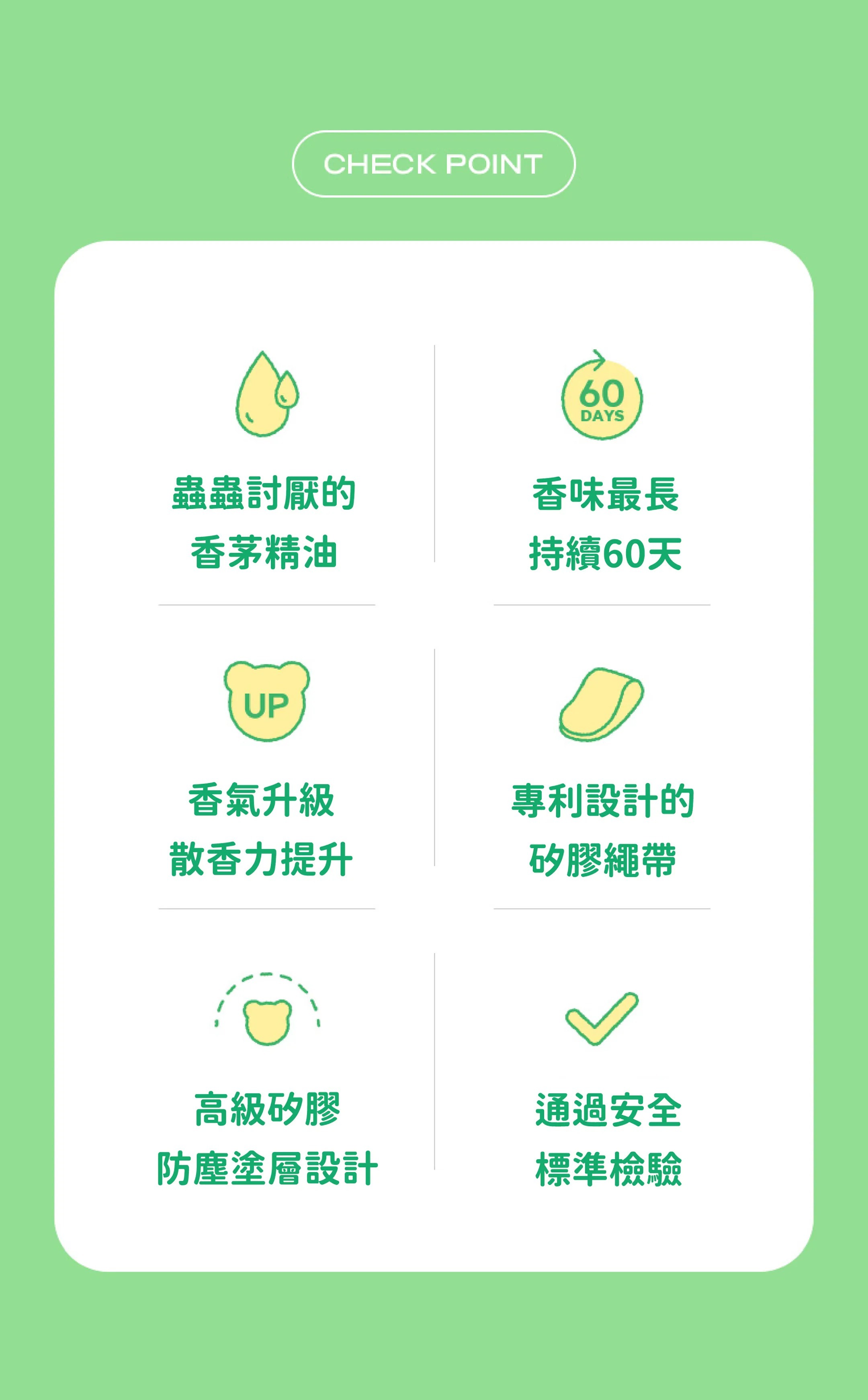 含有蟲蟲們不喜歡的天然香茅精油,香氣最長可持續60天!!