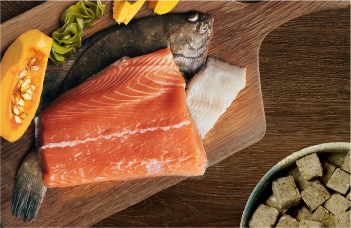 適用於製作犬的主食凍乾,包含80%可持續來源的MSC認證的鮭魚和黃金鰈魚。 。