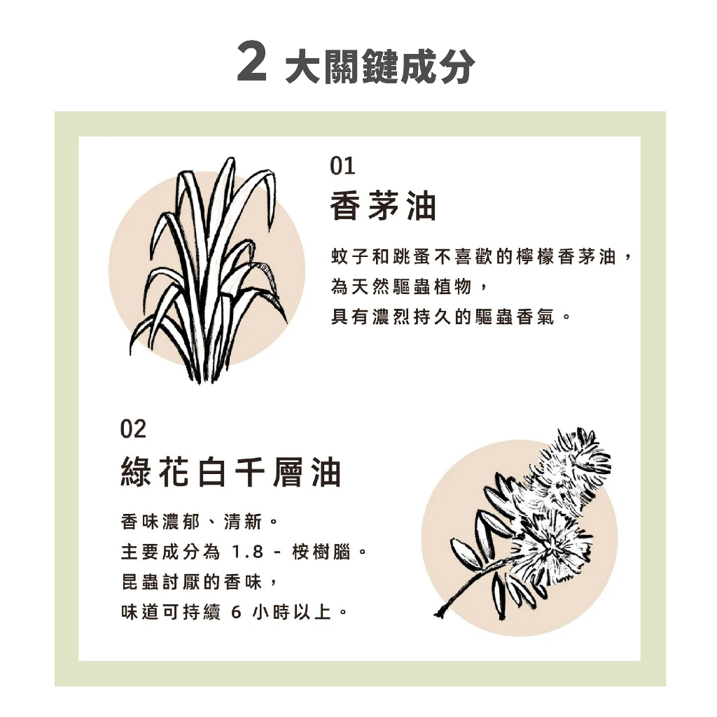 • 除了檸檬香茅油、印楝油等基礎油之外,我們還添加了比避蚊胺更持久的綠花白千層油。