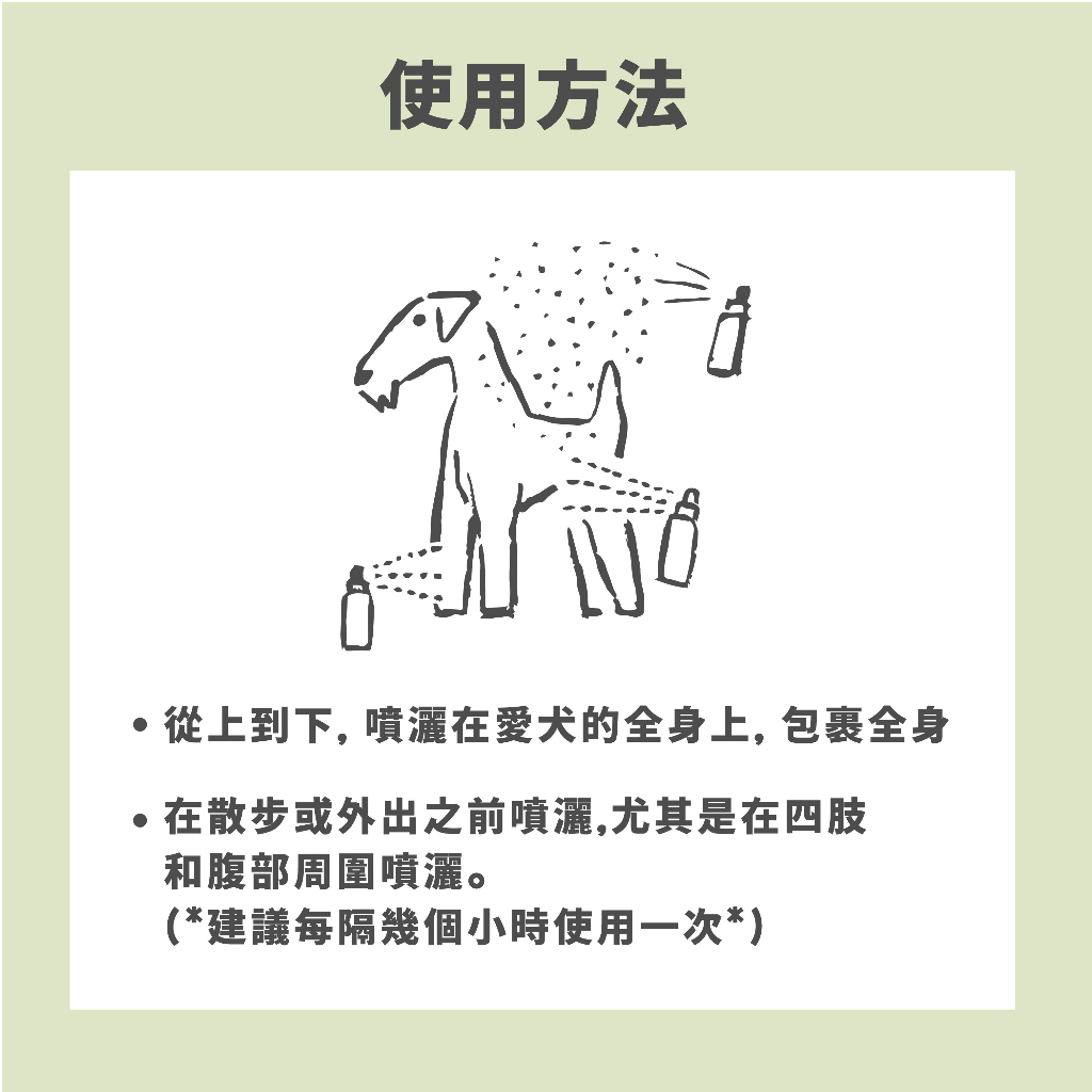 • 不含酒精的防蚊噴霧,不會刺激狗狗的嗅覺。